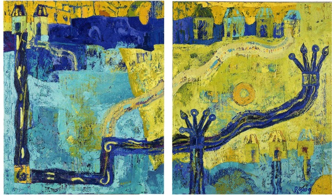Gabriela pinta árboles de la vida que son muerte en fondos iluminados con ciento un mi colores del rosa al violeta combinados con blanco y verde trigonométrico. Superficies terrosas diluidas en y con el color. Pueden ser o no ser reconstrucciones inventadas de lo que tal vez fue o lo que jamás sucedió. Son pretextos para que ella vaya estructurando sus edificios estéticos, sus formas concebidas, pretendidas, mejor, de sensualidad y de pasión. Ella hace pintura y nada más. Y cada una de sus pinturas con obviamente su alter ego.