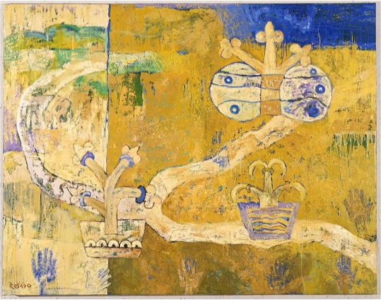 Los códices mesoamericanos son genealógicos, de tributos, de sucesos notables y mitológicos. Aparte del valor histórico, la belleza de algunos de ellos perdura. Se impone el sintetismo, los signos comunicativos establecidos, la grandeza para crear, desde la creación misma, un sistema de expresiones. La grandeza mediante la forma y la caligrafía. En ellos se han basado numerosos artistas contemporáneos para expresar sus sentimientos, su necesidad comunicativa y su deseo simplemente de ser. Extrayendo elementos viejos-nuevos códices, Gabriela Rosado basa su obra de arte en numerales, formas sublimadas de árboles, secuencias animadas, flores, casas y chozas con miembros humanos desollados, diseminados y vueltos a construir en superficies cromatizadas. En sus trabajos no se sabe qué más admirar, si el manejo o invento del color y lo matizado arriesgado y sensual resultado final.
