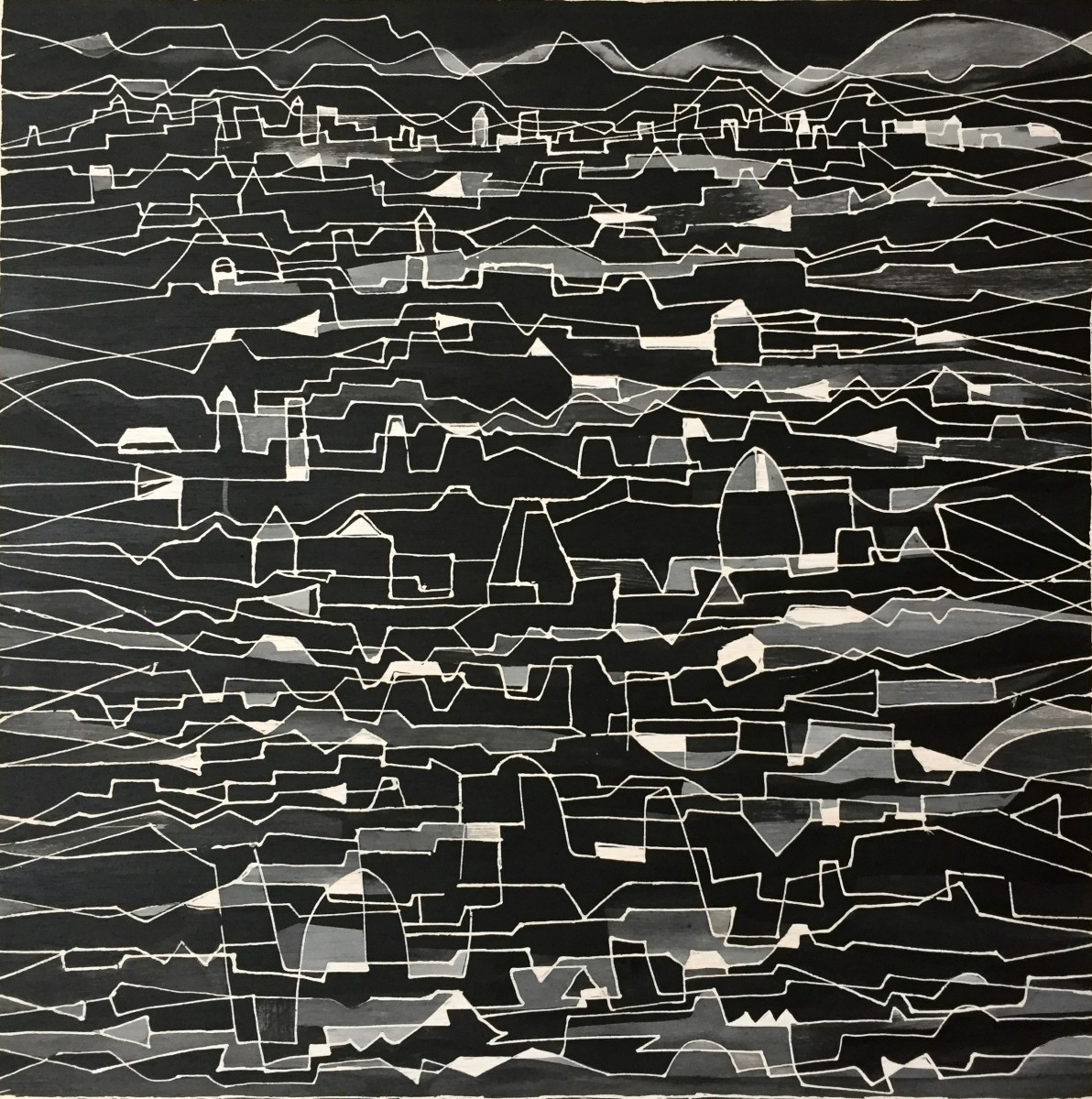 BCN de la serie Ciudades Suspendidas. Tinta /madera 60 x 60 cm